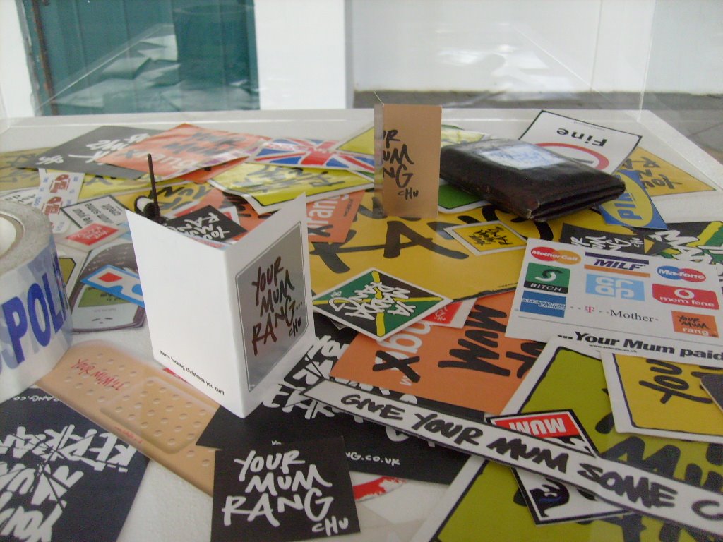 The exhibition also has the largest ever collection of YOUR MUM RANG memorabilia, a stunning sight in itself, although not immediately making the global extent of the sticker campaign visible in the great OUTDOORS. CHU has been dropping YOUR MUM RANG for 8 years as far as i know, the first sight of which i saw in San Francisco 2002. Visit CHU’s flickr site for the ongoing words to your MUM. Or think about creating your own campaign, transform your environment. Just on it.