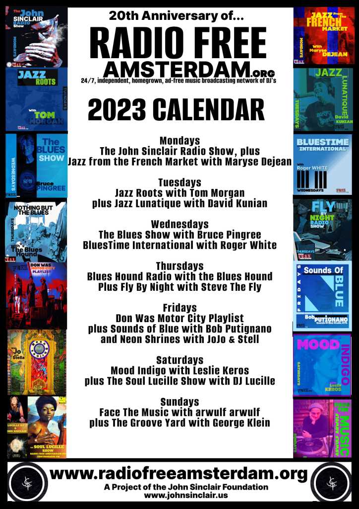 Radio Free Amsterdam is designed as a tribute to the classic American radio stations of the 1950s and 60s when the greatest recordings being issued could be heard on the radio airwaves hour after hour at no cost to the listener and the music was selected by the program hosts guided by their intelligence and knowledge of the music. Accordingly, Radio Free Amsterdam has assembled a working team of independent broadcast producers who provide one or two hours of original programming each week. Each day two one-hour episodes are posted at radiofreeamsterdam.org, and all programs are archived at the John Sinclair Foundation site for listening on demand.